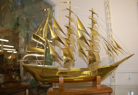 1960's Jere Eames ERA SOLID BRASS CLIPPER SHIPThis is a very well made, solid-brass, hand constructed, original piece of art. It is a representation of the Portuguese clipper ship "Sagres" which was built in 1937 and was 89.7 meters and 869 tons. This was originally coated with a clear brass lacquer which has held up well and we refinished the wood stand.