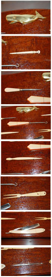 SAILOR'S KITThis original plaque has a collection of personal tools that a sailor in the 1800 -1900rds used on a daily basis. We will try to identify for you (top to bottom... left to right): 1. Solid-brass whale... this is an antique piece but the age is unknown... we polished and buffed this piece then sealed it with a clear brass lacquer. 2. Ivory and steel awl. This tool was used to make holes in sail cloth so primative, hand made bone or ivory needles could be passed through. . 3. Ivory or bone sail needle. This is an older, hand-carved sail needle. 4. Shoe buttonhook… not sure of the material but probably some kind of ivory. This tool was used to hook "loops" that keep early shoes securely on one's foot. 5. Small, hand-carved ivory fid that the sailor used for "fancy" ornamental rope work. 6. Bone (probably whale) "Federal" style "diminutive" fork. Probably used for eating shellfish. 7. Ivory "straight" razor. The owner scratched 1834 on the handle (plus other writing). Because of the age and the quality of this item it is thought that this was owned by a Captain or ships officer. 8. Two forged steel sail needles… Made in England. It's impossible to exactly date the above items but all except for the brass whale are circa from the mid 1800s to the very early 1900s. The mounting board is solid mahogany with four coats of hand-rubbed spar varnish. Size: The plaque measures 18” long and 81/4” high. Solid brass mounting hardware is included. |